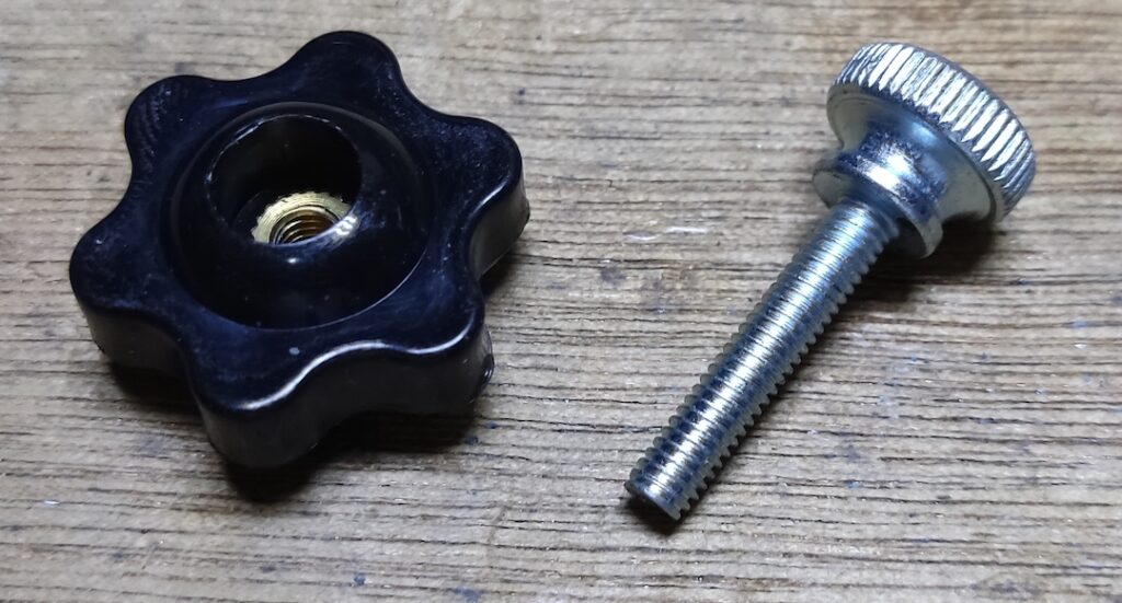 The adjustment knob that allows me to rotate or reconfigure the helping hands has lost it’s threads. I guess it’s going to happen sooner or later, I’ve been using to tool for decades :-). So I need to figure out a replacement. I happened to have some extra long m4 bolts with a knurled knob as a head and a nut with a knob.